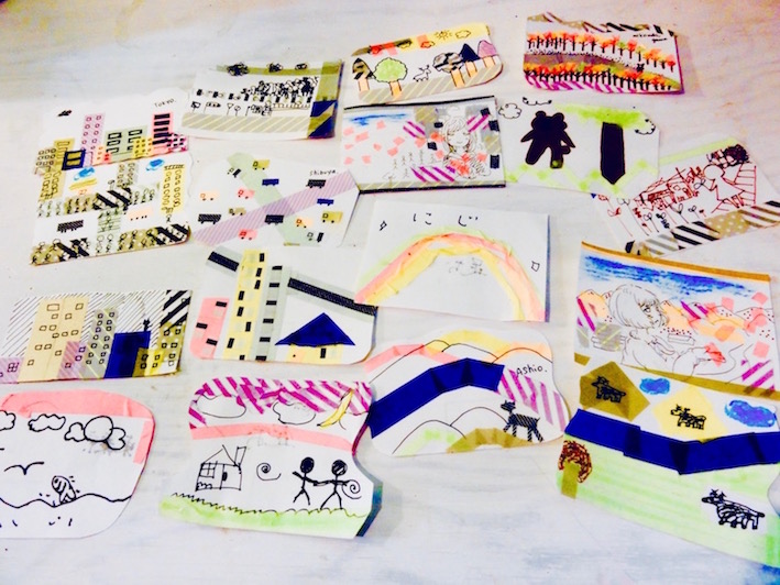 床にはシンブンシャのこども達の作品!東京と足尾の街をイメージして制作してくれたステッカー作品を展示しました。