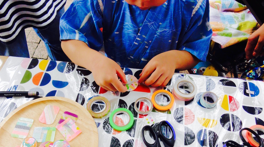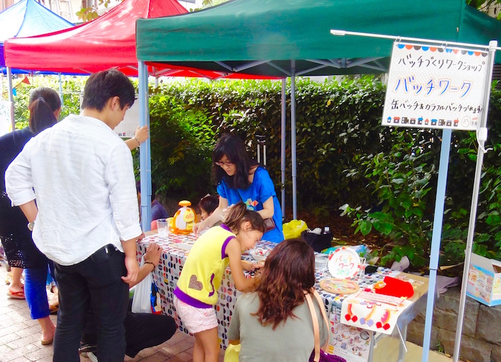 あちこち地域にお邪魔しての活動紹介!こちらは世田谷区で開催された『三軒茶屋まち道楽』にて、バッチづくりワークショップ『バッチワーク』を開催した時の様子。